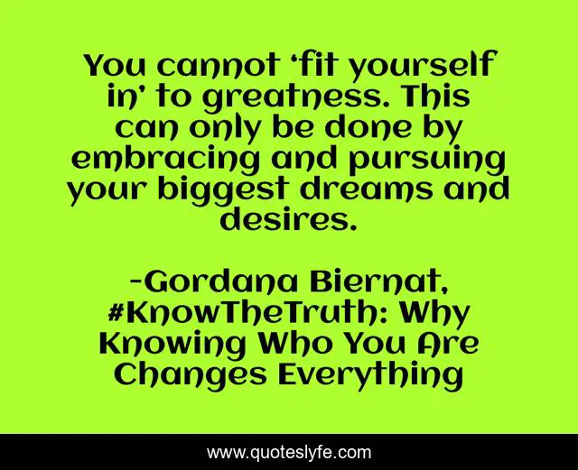 This page presents the quote "You cannot ‘fit yourself in’ to greatness. This can only be done by embracing and pursuing your biggest dreams and desires.". Author of this quote is Gordana Biernat, #KnowTheTruth: Why Knowing Who You Are Changes Everything. This quote is about confidence, creation, desires, vibration, positive, motivational, focus, reality, oneness,.