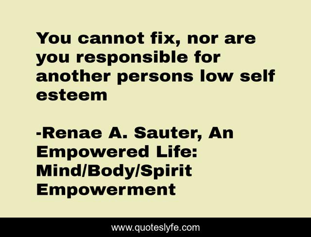 This page presents the quote "You cannot fix, nor are you responsible for another persons low self esteem". Author of this quote is Renae A. Sauter, An Empowered Life: Mind/Body/Spirit Empowerment. This quote is about self-love, psychology, personal-growth, self-development, self-worth, mental-health, mind-body-spirit, inspirational, self-help,.