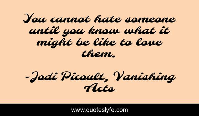 This page presents the quote "You cannot hate someone until you know what it might be like to love them.". Author of this quote is Jodi Picoult, Vanishing Acts. This quote is about hate, love, affection,.