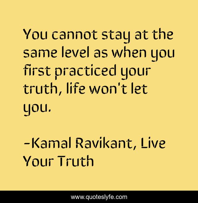 This page presents the quote "You cannot stay at the same level as when you first practiced your truth, life won't let you.". Author of this quote is Kamal Ravikant, Live Your Truth. This quote is about self-realization, stagnation, self-improvement, truth, improvement,.