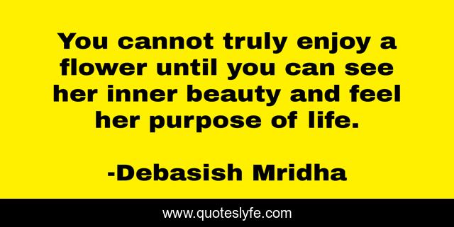 This page presents the quote "You cannot truly enjoy a flower until you can see her inner beauty and feel her purpose of life.". Author of this quote is Debasish Mridha. This quote is about inner-beauty, philosophy, debasish-mridha, quotes, enjoy-a-flower, inspirational, enthusiasm, purpose-of-life, debasish-mridha-m-d,.