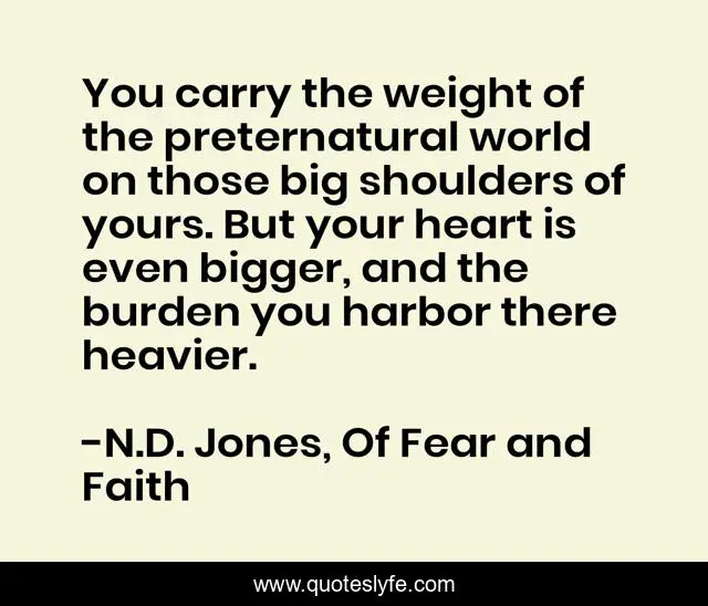 "N.D. Jones, Of Fear and Faith Quotes." Quoteslyfe.com, 2025. Mon. 08 Dec. 2025. <https://www.quoteslyfe.com/quote/You-carry-the-weight-of-the-preternatural-131971>.