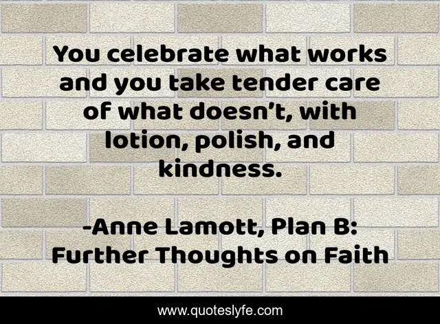 This page presents the quote "You celebrate what works and you take tender care of what doesn’t, with lotion, polish, and kindness.". Author of this quote is Anne Lamott, Plan B: Further Thoughts on Faith. This quote is about polish, kindness, lotion,.