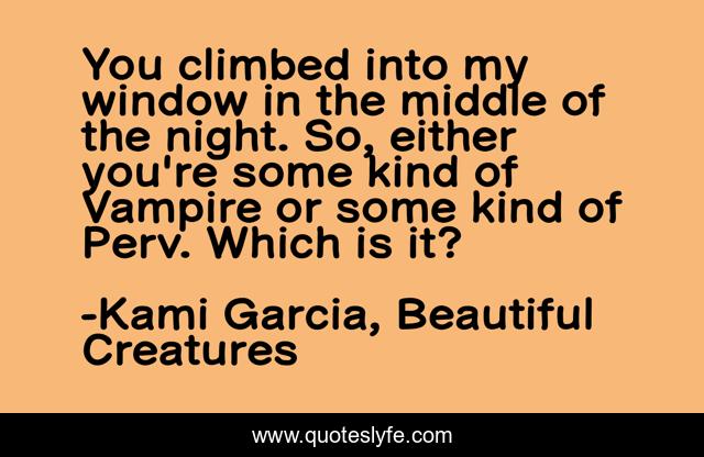 This page presents the quote "You climbed into my window in the middle of the night. So, either you're some kind of Vampire or some kind of Perv. Which is it?". Author of this quote is Kami Garcia, Beautiful Creatures. This quote is about humor, choices,.