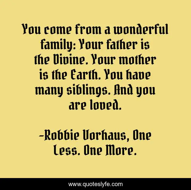 This page presents the quote "You come from a wonderful family: Your father is the Divine. Your mother is the Earth. You have many siblings. And you are loved.". Author of this quote is Robbie Vorhaus, One Less. One More.. This quote is about earth, divine,.