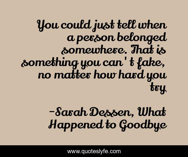 This page presents the quote "You could just tell when a person belonged somewhere. That is something you can't fake, no matter how hard you try". Author of this quote is Sarah Dessen, What Happened to Goodbye. This quote is about home, belonging, belong, fake,.