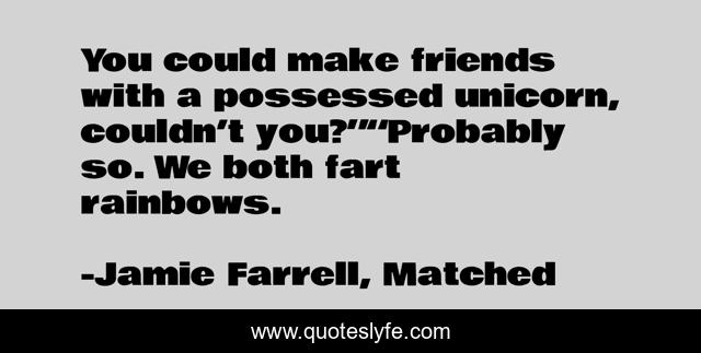 This page presents the quote "You could make friends with a possessed unicorn, couldn’t you?”“Probably so. We both fart rainbows.". Author of this quote is Jamie Farrell, Matched. This quote is about adult-ice-cream-flavors, country-rock-star, contemporary-romance, lawyer,.