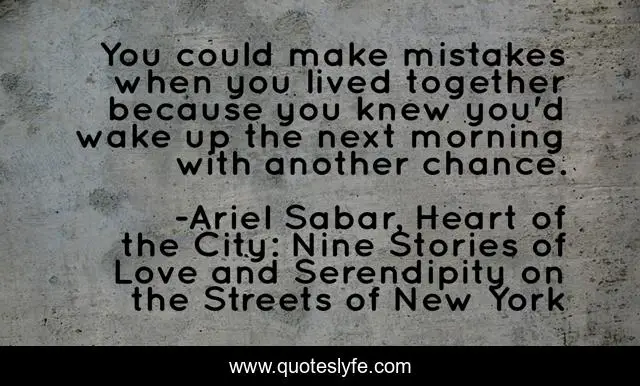 This page presents the quote "You could make mistakes when you lived together because you knew you'd wake up the next morning with another chance.". Author of this quote is Ariel Sabar, Heart of the City: Nine Stories of Love and Serendipity on the Streets of New York. This quote is about romance, serendipity, chance, love-story,.