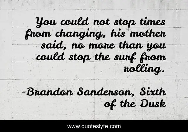 This page presents the quote "You could not stop times from changing, his mother said, no more than you could stop the surf from rolling.". Author of this quote is Brandon Sanderson, Sixth of the Dusk. This quote is about surf, could, stop, times, mother, rolling, changing, more,.