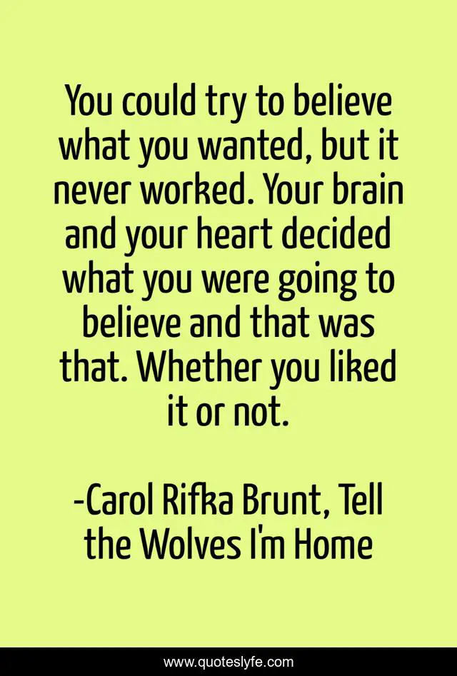 This page presents the quote "You could try to believe what you wanted, but it never worked. Your brain and your heart decided what you were going to believe and that was that. Whether you liked it or not.". Author of this quote is Carol Rifka Brunt, Tell the Wolves I'm Home. .