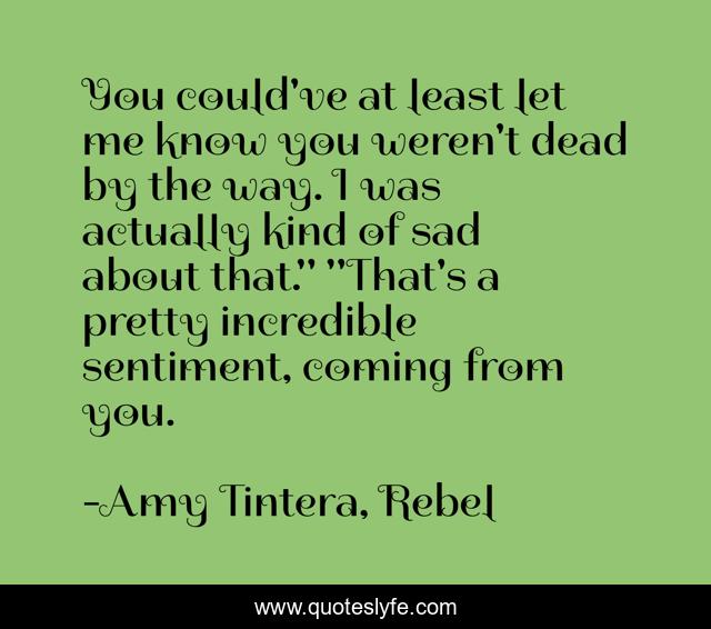 This page presents the quote "You could've at least let me know you weren't dead by the way. I was actually kind of sad about that." "That's a pretty incredible sentiment, coming from you.". Author of this quote is Amy Tintera, Rebel. This quote is about ya, young-adult, sci-fi, science-fiction,.