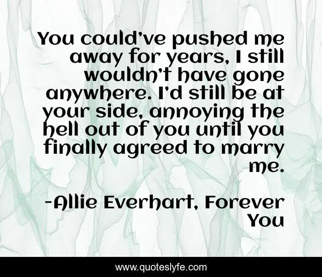 This page presents the quote "You could’ve pushed me away for years, I still wouldn’t have gone anywhere. I’d still be at your side, annoying the hell out of you until you finally agreed to marry me.". Author of this quote is Allie Everhart, Forever You. This quote is about new-adult, new-adult-contemporary-romance, new-adult-romance, college-romance,.