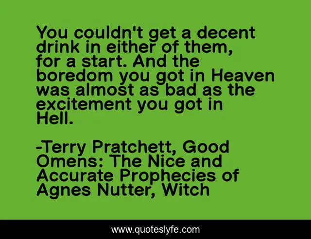 This page presents the quote "You couldn't get a decent drink in either of them, for a start. And the boredom you got in Heaven was almost as bad as the excitement you got in Hell.". Author of this quote is Terry Pratchett, Good Omens: The Nice and Accurate Prophecies of Agnes Nutter, Witch. This quote is about hell, heaven,.