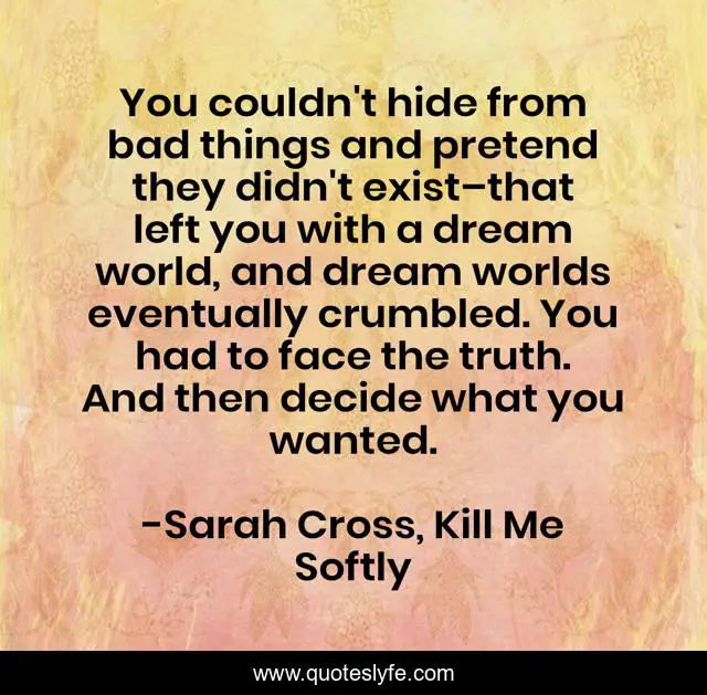 This page presents the quote "You couldn't hide from bad things and pretend they didn't exist–that left you with a dream world, and dream worlds eventually crumbled. You had to face the truth. And then decide what you wanted.". Author of this quote is Sarah Cross, Kill Me Softly. This quote is about fantasy, reality, dream, kill-me-softly, sarah-cross,.