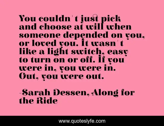 This page presents the quote "You couldn't just pick and choose at will when someone depended on you, or loved you. It wasn't like a light switch, easy to turn on or off. If you were in, you were in. Out, you were out.". Author of this quote is Sarah Dessen, Along for the Ride. This quote is about relationships, loved, complicated,.