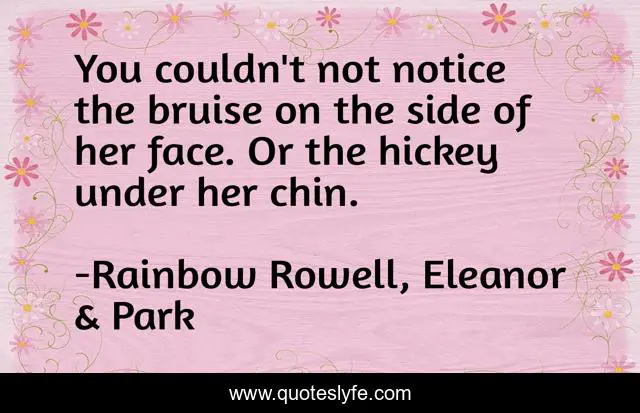 This page presents the quote "You couldn't not notice the bruise on the side of her face. Or the hickey under her chin.". Author of this quote is Rainbow Rowell, Eleanor & Park. This quote is about domestic-abuse, bruise, abuse, lust, hickey, eleanor-and-park,.