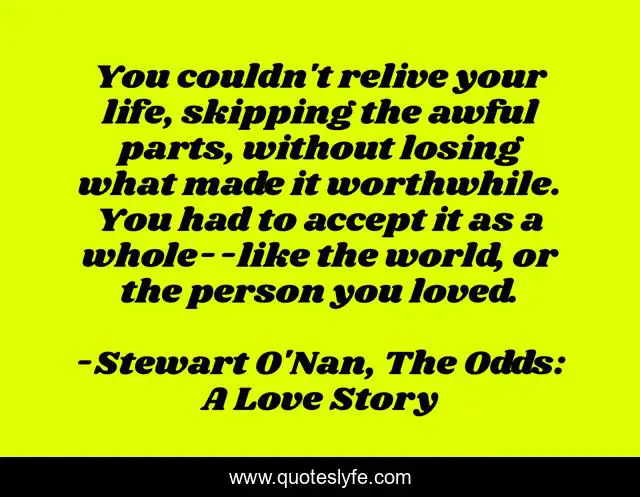 This page presents the quote "You couldn't relive your life, skipping the awful parts, without losing what made it worthwhile. You had to accept it as a whole--like the world, or the person you loved.". Author of this quote is Stewart O'Nan, The Odds: A Love Story. This quote is about life, acceptance, love, worth, affection,.