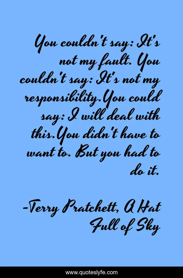 This page presents the quote "You couldn't say: It's not my fault. You couldn't say: It's not my responsibility.You could say: I will deal with this.You didn't have to want to. But you had to do it.". Author of this quote is Terry Pratchett, A Hat Full of Sky. .