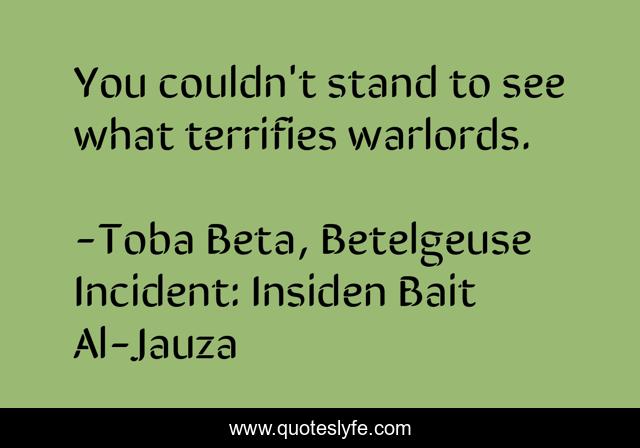 This page presents the quote "You couldn't stand to see what terrifies warlords.". Author of this quote is Toba Beta, Betelgeuse Incident: Insiden Bait Al-Jauza. This quote is about tremble, unable, warlord, understanding,.