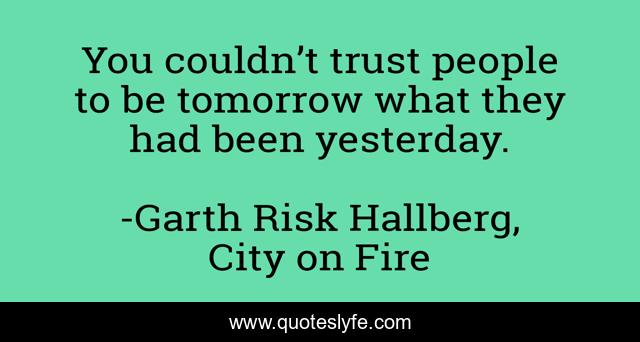 This page presents the quote "You couldn’t trust people to be tomorrow what they had been yesterday.". Author of this quote is Garth Risk Hallberg, City on Fire. This quote is about trust, people,.
