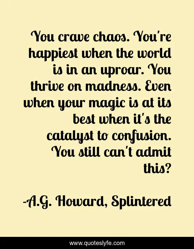 "A.G. Howard, Splintered Quotes." Quoteslyfe.com, 2025. Sun. 07 Dec. 2025. <https://www.quoteslyfe.com/quote/You-crave-chaos-You-re-happiest-when-221089>.