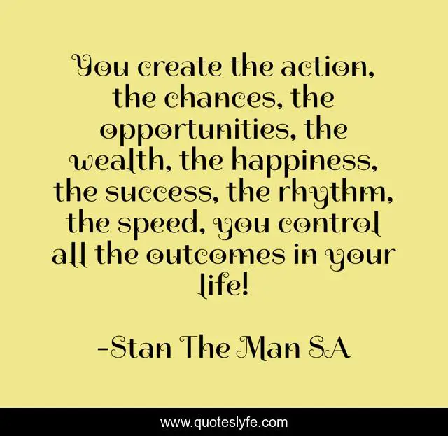 This page presents the quote "You create the action, the chances, the opportunities, the wealth, the happiness, the success, the rhythm, the speed, you control all the outcomes in your life!". Author of this quote is Stan The Man SA. This quote is about chances, inspirational-life, focus-on-your-dreams, lifestyle, purpose-driven-life,.