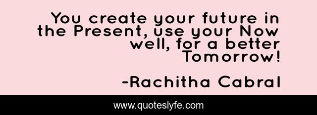 This page presents the quote "You create your future in the Present, use your Now well, for a better Tomorrow!". Author of this quote is Rachitha Cabral. This quote is about quotes-on-happiness, quotes-on-acceptance, future, lifestyle, quotes-about-life,.