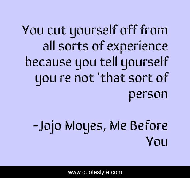 This page presents the quote "You cut yourself off from all sorts of experience because you tell yourself you re not 'that sort of person". Author of this quote is Jojo Moyes, Me Before You. .