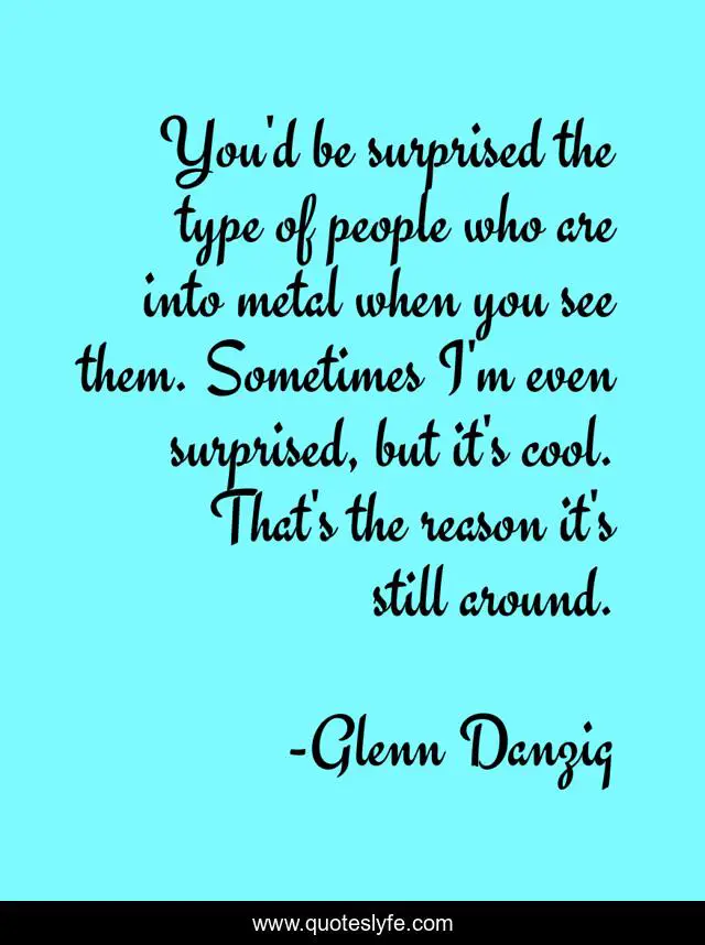 This page presents the quote "You'd be surprised the type of people who are into metal when you see them. Sometimes I'm even surprised, but it's cool. That's the reason it's still around.". Author of this quote is Glenn Danzig. This quote is about see, people,.