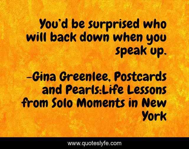 This page presents the quote "You’d be surprised who will back down when you speak up.". Author of this quote is Gina Greenlee, Postcards and Pearls:Life Lessons from Solo Moments in New York. This quote is about travel, new-york-city, new-york-travel, travel-writing, traveling,.