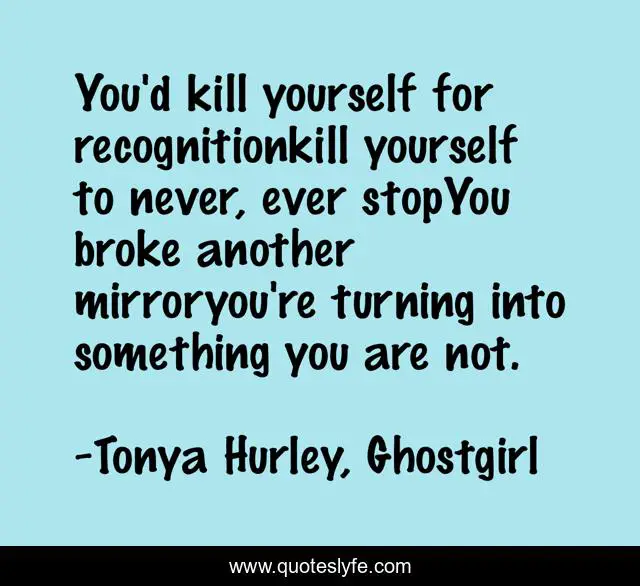 This page presents the quote "You'd kill yourself for recognitionkill yourself to never, ever stopYou broke another mirroryou're turning into something you are not.". Author of this quote is Tonya Hurley, Ghostgirl. This quote is about kill, ghostgirl, recognition, yourself,.