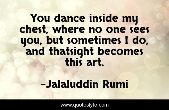 This page presents the quote "You dance inside my chest, where no one sees you, but sometimes I do, and thatsight becomes this art.". Author of this quote is Jalaluddin Rumi. This quote is about rumi, love, poetry, affection,.