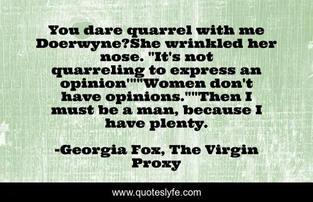 This page presents the quote "You dare quarrel with me Doerwyne?She wrinkled her nose. "It's not quarreling to express an opinion'""Women don't have opinions.""Then I must be a man, because I have plenty.". Author of this quote is Georgia Fox, The Virgin Proxy. This quote is about comical, historical, insightful,.