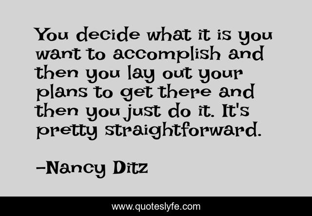 This page presents the quote "You decide what it is you want to accomplish and then you lay out your plans to get there and then you just do it. It's pretty straightforward.". Author of this quote is Nancy Ditz. .