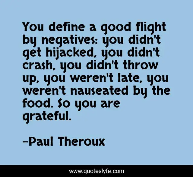 "Paul Theroux Quotes." Quoteslyfe.com, 2025. Fri. 05 Dec. 2025. <https://www.quoteslyfe.com/quote/You-define-a-good-flight-by-negatives-311933>.