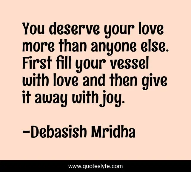 This page presents the quote "You deserve your love more than anyone else. First fill your vessel with love and then give it away with joy.". Author of this quote is Debasish Mridha. This quote is about miraboli, fill-yourself-with-love, oscar-wilde, debasish-mridha, philosophy, you-deserve-your-love, give-love-away, quotes, debasish-mridha-md,.