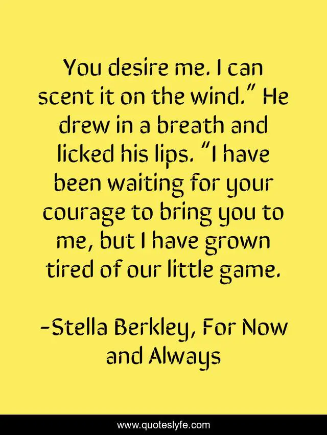 This page presents the quote "You desire me. I can scent it on the wind.” He drew in a breath and licked his lips. “I have been waiting for your courage to bring you to me, but I have grown tired of our little game.". Author of this quote is Stella Berkley, For Now and Always. This quote is about fantasy, erotic-romance, shifter,.