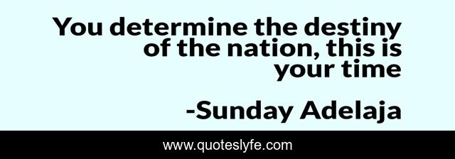 This page presents the quote "You determine the destiny of the nation, this is your time". Author of this quote is Sunday Adelaja. This quote is about destiny, calling, time, fulfillment, purpose,.