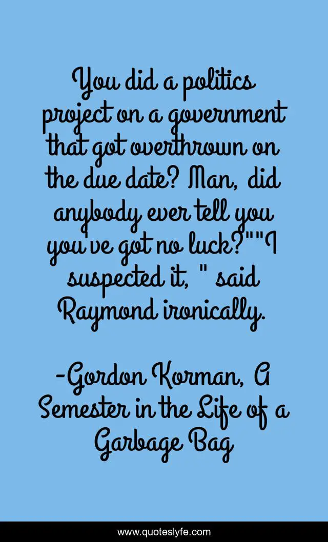 This page presents the quote "You did a politics project on a government that got overthrown on the due date? Man, did anybody ever tell you you've got no luck?""I suspected it, " said Raymond ironically.". Author of this quote is Gordon Korman, A Semester in the Life of a Garbage Bag. This quote is about school, humor, project, bad-luck, politics, luck,.