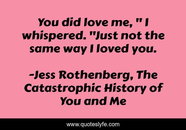 This page presents the quote "You did love me, " I whispered. "Just not the same way I loved you.". Author of this quote is Jess Rothenberg, The Catastrophic History of You and Me. This quote is about brie-eagan, love, affection, love-hurts,.