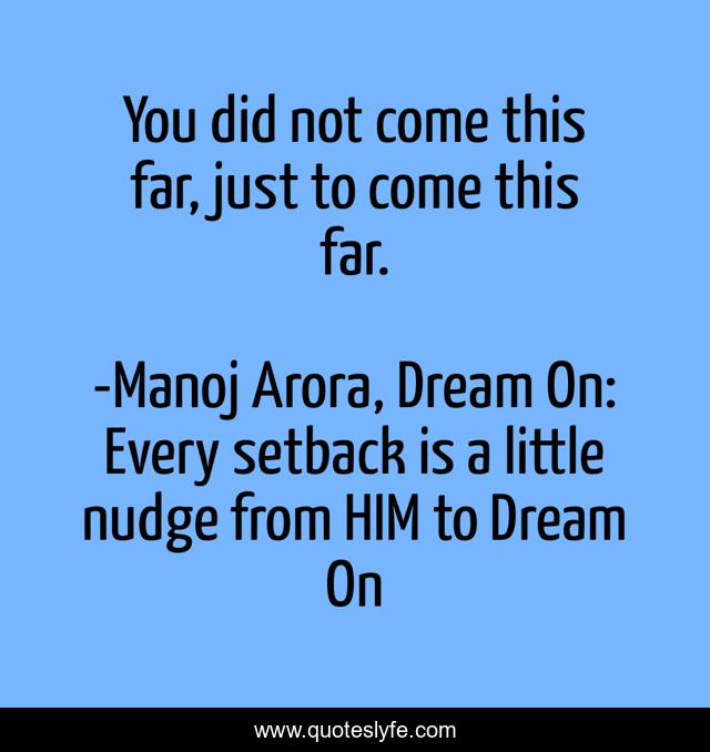 This page presents the quote "You did not come this far, just to come this far.". Author of this quote is Manoj Arora, Dream On: Every setback is a little nudge from HIM to Dream On. This quote is about never-give-up-on-your-dreams, dream-on-dreamer, carry-on, never-giving-up, dream-on, never-quit, dream, dreams, never-give-up,.