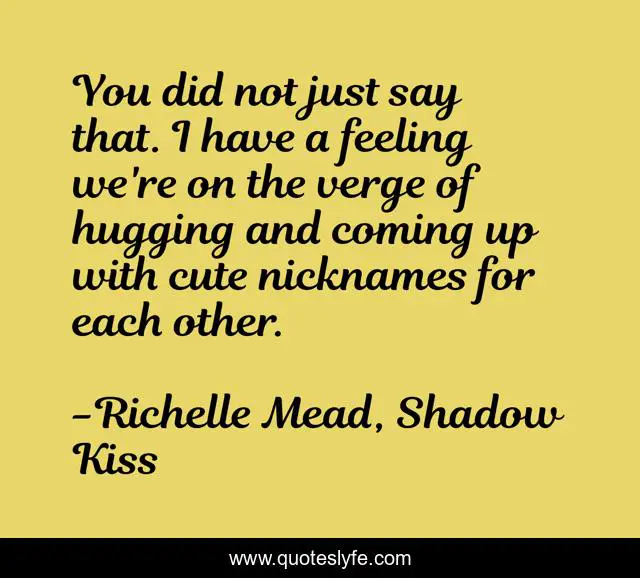 This page presents the quote "You did not just say that. I have a feeling we're on the verge of hugging and coming up with cute nicknames for each other.". Author of this quote is Richelle Mead, Shadow Kiss. This quote is about sarcasm, humor,.