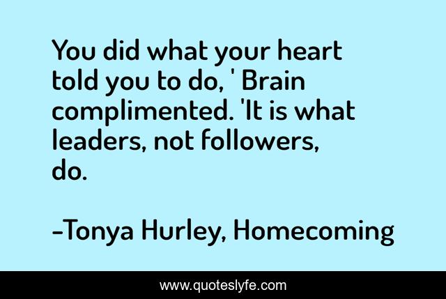 This page presents the quote "You did what your heart told you to do, ' Brain complimented. 'It is what leaders, not followers, do.". Author of this quote is Tonya Hurley, Homecoming. This quote is about leadership, ghostgirl,.