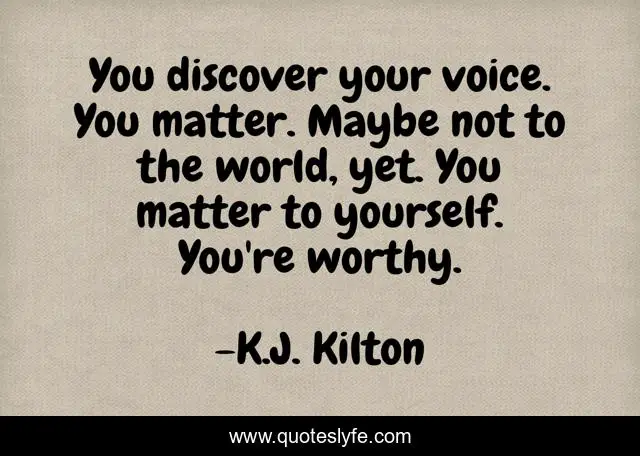 This page presents the quote "You discover your voice. You matter. Maybe not to the world, yet. You matter to yourself. You're worthy.". Author of this quote is K.J. Kilton. This quote is about voice, discover,.