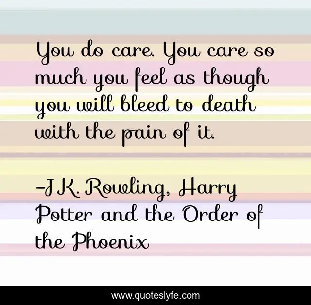 This page presents the quote "You do care. You care so much you feel as though you will bleed to death with the pain of it.". Author of this quote is J.K. Rowling, Harry Potter and the Order of the Phoenix. This quote is about fiction, young-adult-fiction, harry-potter, reality,.