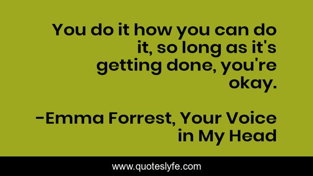 This page presents the quote "You do it how you can do it, so long as it's getting done, you're okay.". Author of this quote is Emma Forrest, Your Voice in My Head. This quote is about enthusiasm, life, depression, inspirational,.