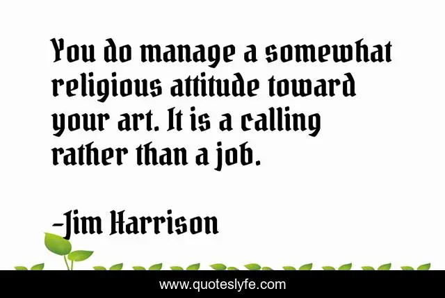 This page presents the quote "You do manage a somewhat religious attitude toward your art. It is a calling rather than a job.". Author of this quote is Jim Harrison. This quote is about job, art,.