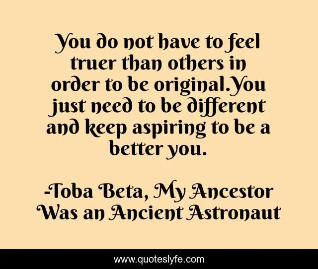 This page presents the quote "You do not have to feel truer than others in order to be original.You just need to be different and keep aspiring to be a better you.". Author of this quote is Toba Beta, My Ancestor Was an Ancient Astronaut. This quote is about aspire, better, different, original,.