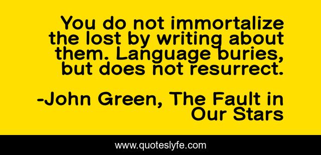 This page presents the quote "You do not immortalize the lost by writing about them. Language buries, but does not resurrect.". Author of this quote is John Green, The Fault in Our Stars. This quote is about life, death, language, writing,.