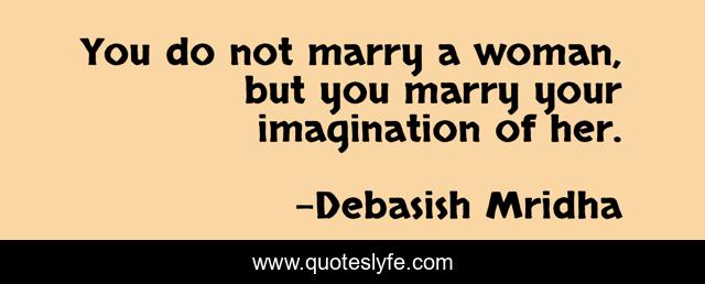 This page presents the quote "You do not marry a woman, but you marry your imagination of her.". Author of this quote is Debasish Mridha. This quote is about debasish, mridha, marry, philosophy, debasish-mridha, imagination, woman, marriage,.